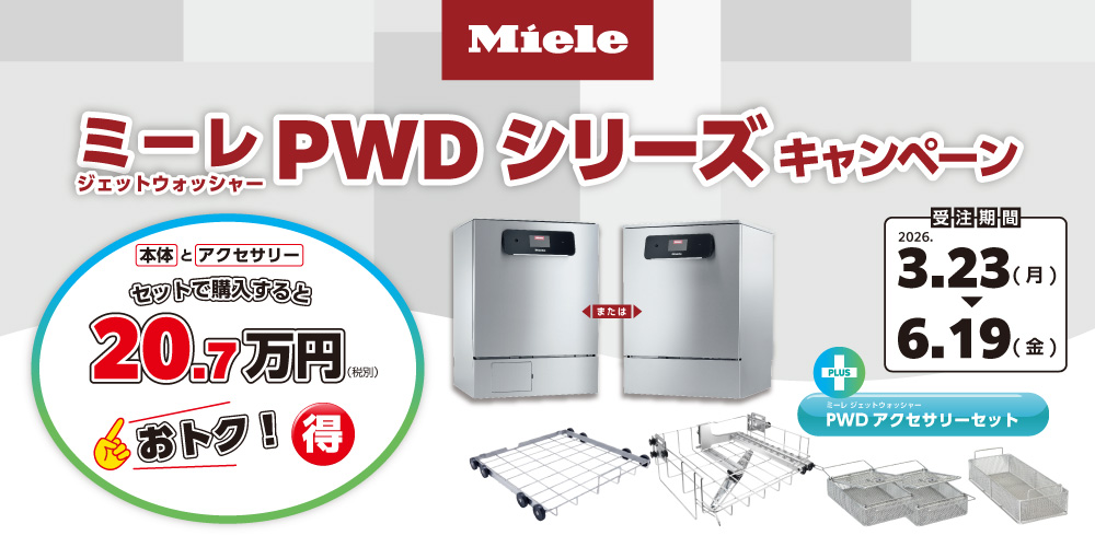 2026年3月23日スタート!ミーレPWDキャンペーン 受注期間:2026年3月23日-6月19日 期間中、ミーレ ジェットウォッシャーPWDシリーズご購入時に、ミーレ ジェットウォッシャーPWDアクセサリーセットを特別価格にてご提供いたします。 ※2026年9月18日(金)までに取付が完了する場合に限り、キャンペーン特典が適用されます。 一覧に戻る お問い合わせはこちら