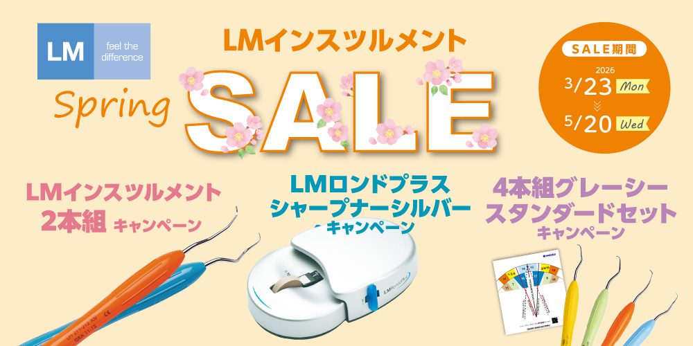 2026年3月23日スタート!LMキャンペーン セール期間:2026年3月23日-5月20日 【LM2本組キャンペーン】 期間中、対象のLMインスツルメントの2本組セットを特別価格にてご提供いたします。 【LMロンドプラス シャープナ― シルバー キャンペーン】 期間中、LMロンドプラス シャープナーシルバーを特別価格にてご提供いたします。 【LM4本組スタンダードセット キャンペーン】 期間中、LMグレーシーキュレット(XSi)4本組+LM専用シャープニングガイド(非売品)のお得なセットを特別価格にてご提供いたします。 一覧に戻る お問い合わせはこちら